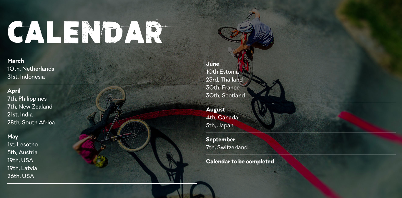 Das ist was Neues! 2018 gibt es die erste Red Bull Pumptrack World Championship Tournee. Endlich wird Pumptrack Racing so ernst genommen, wie es schon lange geschehen hätte sollen. Der Name World Tour passt, denn es geht von Neuseeland über die USA, nach Chile und Indien bis nach Frankreich und Japan.