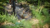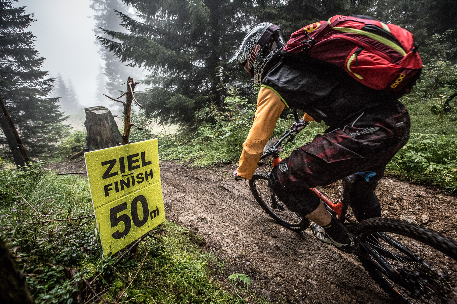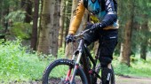 Am Donnerstag Abend drehte ich schon meine ersten Runden im Trailcenter Rabenberg und stellte fest, dass das Ganze doch relativ tretlastig ist. Falls also jemand von euch demnächst nach Rabenberg fährt – lass’ das dicke Big Bike zu Hause! Der Rabenberg liegt nämlich auf moderaten 913 Metern und die Trails verlaufen teilweise auf ebener Strecke, so dass man richtig reintreten muss, um über Wurzeln und Steine zu kommen. Aber ich hatte mit meinem zuverlässigen Rennhobel, dem SCOTT Genius LT 710, eine ausgezeichnete Wahl getroffen. Der leichte Carbon-Rahmen kletterte mit den 650B-Laufrädern die technischen Uphills richtig schnell nach oben. Die Downhill-Passagen waren alle human und machbar, lediglich die feuchten Steine und Wurzeln machten die Abfahrten etwas tricky. Das Steinfeld sollte noch eine weitere Herausforderung werden: Der Regen hatte den Trail aufgeweicht und man rutschte einfach überall drüber. Da auch das Steinfeld mehr oder weniger in der Ebene liegt, hieß es, ordentlich Schwung mitnehmen, draufhalten und bloß nicht anhalten!
