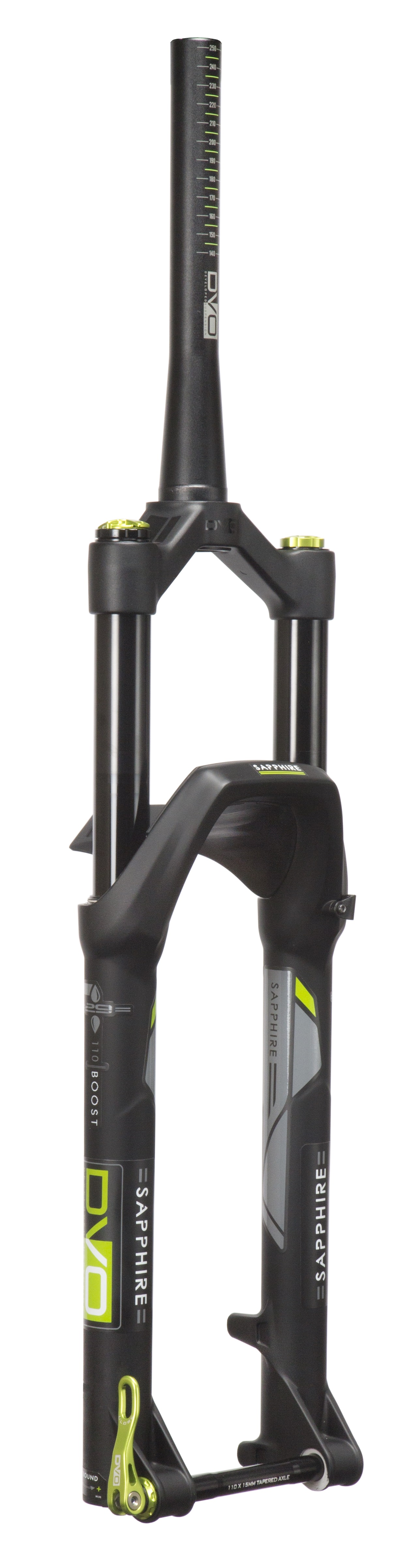 Das Flaggschiff von DVO Suspension ist die grün eloxierte Upside-Down Federgabel Emerald, deren Einsatzzweck mit 203mm Federweg für Downhill-Racer prädestiniert ist. Die Besonderheit ist der Carbon Torsion Arch (CTA), ein patentierter, einteiliger Carbon-Tauchrohrschutz mit zwei Gabelbrücken, der zur Erhöhung der Torsionssteifigkeit an der geschmiedeten Magnesium-Achsaufnahme verschraubt wird.
