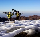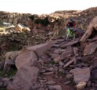 Nachdem wir uns über einen Karrenweg nach oben geschraubt haben, stehen wir plötzlich vor einer schier endlosen Steilwand. Was tun? Da müssen wir rauf! Nach kurzer Überlegung und Studie der besten Linie, schultern wir unsere Bikes und beginnen mit dem Aufstieg. In der Hälfte angekommen wird uns klar, dass wir diese Route auf gar keinen Fall mehr zurück können/wollen. Mal sehen was uns oben erwartet. Nach ca. 600hm Tragepassage stehen wir am Gipfel. Gipfel? Nein! Wir stehen am Anfang eines verwunschenen Hochtals, im Hintergrund ragen die 4000er schneebedeckt in die Höhe. Das wäre ein noch perfekterer Lagerplatz, bloß kommt man leider nicht so einfach hin! Wir setzen uns auf einen Felsen und saugen die Atmosphäre in uns auf. Jetzt müssen wir uns einen Überblick über mögliche Abfahrten verschaffen. Viele Möglichkeiten gibt es nicht. Nach kurzer Diskussion begeben wir uns in eine recht „tricky“ Abfahrt. Angedeutete Ziegenpfade zeigen uns den Weg durch loses Gestein. Der Trail führt uns durch eine Steilwand ins nächste Tal. Angefeuert durch die Ziegenhirten, ein paar hundert Meter unter uns, kämpfen wir uns durch die doch sehr technisch anspruchsvollen Passagen nach unten. Yeah, die Arme sind vom Bremsen und puschen der Räder um ein Vielfaches angewachsen…