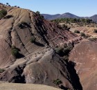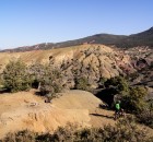 Wieder ins gelobte Tal, aber zwei /drei andere Kämme entlang. Dahingleiten lassen, den letzten Tag auf dem Rad genießen, in der Sonne die traumhafte Landschaft genießen, Sonne tanken und hier und da ein bisschen rumspielen. Die Farbwechsel sind immer wieder atemraubend. Schwarzgrauer Split wechselt sich ab mit Gelbem, Rotem und teilweise fast Violettem. Das Ganze ist durchzogen von einem endlosen Netz aus kleinen und großen Erosionsrinnen, die die wellige Landschaft zerfurchen. Wie sieht es wohl hier aus wenn es regnet? Macht es ja zum Glück fast nie! Groteske, von Ziegen und der dürre geformte Bonsai-Büsche verleihen der Atmosphäre etwas Geheimnisvolles, Verwunschenes. Wow, ist das schön hier. Trotz schwerer Beine sitzen wir, bis die letzten Sonnenstrahlen hinter den Gipfeln verschwinden, auf dem Rad. Es macht zu viel Spaß um sich das entgehen zu lassen.